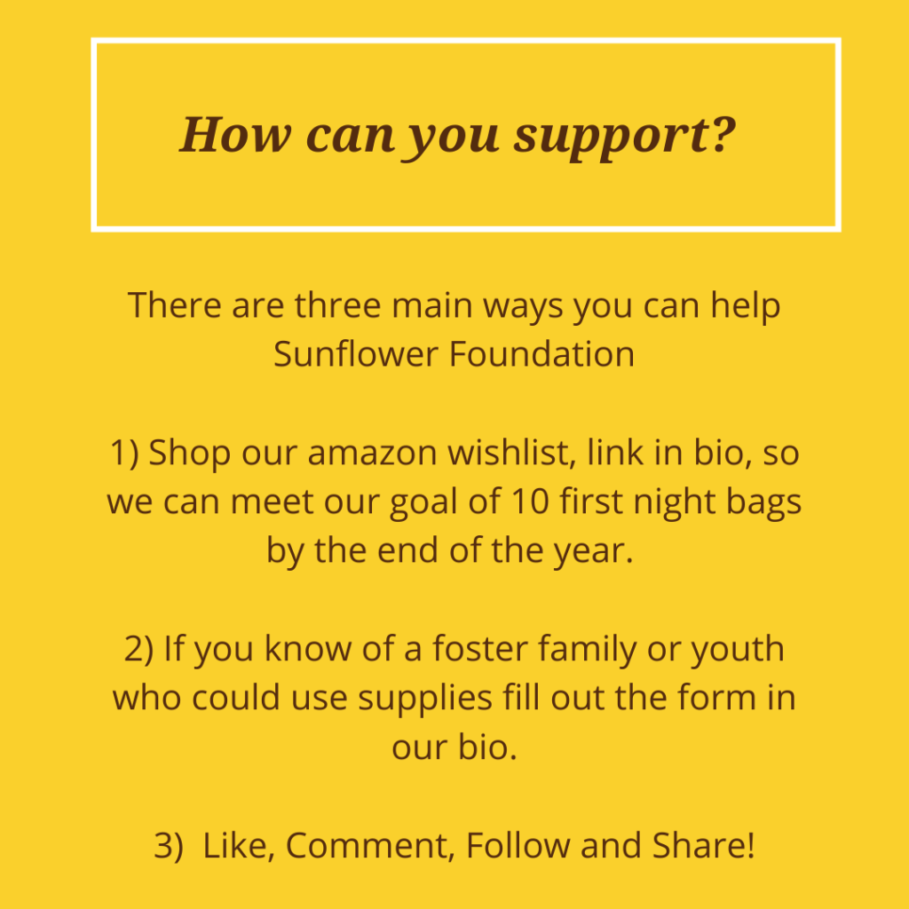 Therefore, I started a foundation called The Sunflower Fosters Foundation. I am setting small goals for myself and working directly with the Department of Child Services and Social workers to get needed resources directly to foster youth in the middle Tennessee Area.