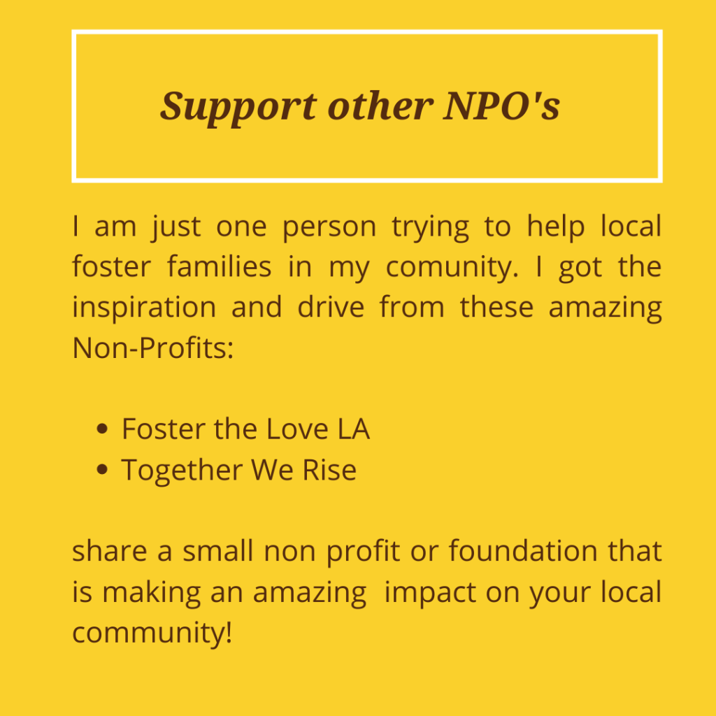 - Reach out: If you know or work with a foster family or foster youth that is in need of anything reach out and I will see what I can do or point you in the right direction of resources!